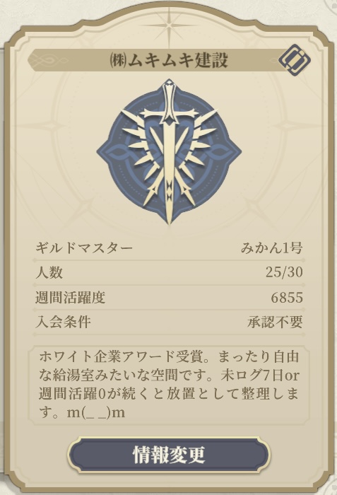 ギルド名「(株)ムキムキ建設」 ギルドメンバー募集中! ホワイト企業アワード受賞。基本的に自由なチャット空間の給湯室。無断欠勤7日以上で免職です。m(_ _)m